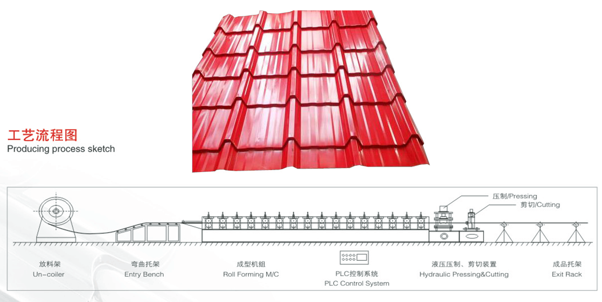 彩鋼琉璃瓦設(shè)備主要由放料機(jī)、進(jìn)料導(dǎo)入平臺、成型主機(jī)、沖模壓型裝置、成型剪切裝置、液壓站、電腦控制系統(tǒng)、成品托架等幾部分組成。