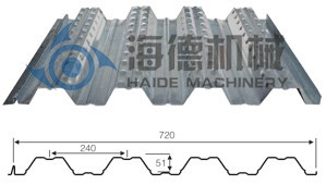 該機(jī)生產(chǎn)的鋼樓承板形狀簡(jiǎn)潔、波度大、強(qiáng)度高、安裝時(shí)鋪置點(diǎn)焊鋼筋網(wǎng)后與混凝土現(xiàn)場(chǎng)澆灌結(jié)合,粘合性好。在高層建筑上既可以省去鋼模板又可以減輕樓層承載,在達(dá)到同等承受能力的前提下,使工程用鋼量減少,從節(jié)省投資。