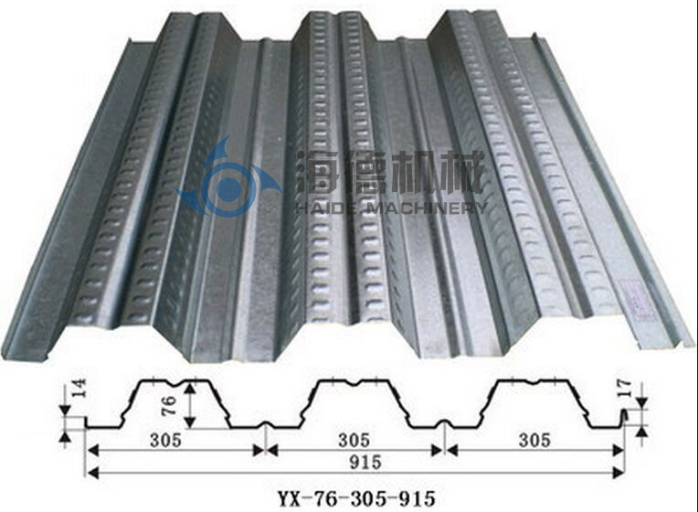 該機生產的鋼樓承板形狀簡潔、波度大、強度高、安裝時鋪置點焊鋼筋網后與混凝土現場澆灌結合,粘合性好。在高層建筑上既可以省去鋼模板又可以減輕樓層承載,在達到同等承受能力的前提下,使工程用鋼量減少,從節省投資。