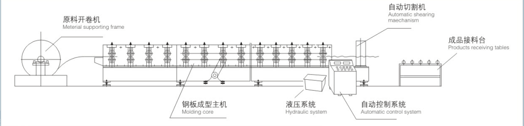 該機主要由放料機、進料導入平臺、成型主機、成型剪切裝置、液壓站、電腦控制系統等幾部分組成。