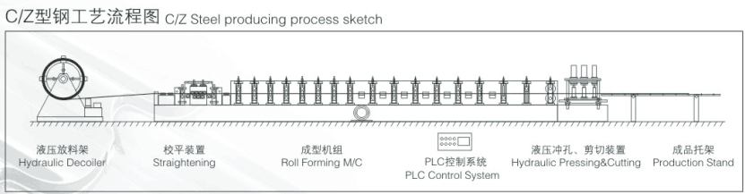 經該機輥軋的C型檁條成品具有良好的抗彎抗壓性能,平直度好、全自動定長切割、自動沖孔、自動化程度高,安裝快捷方便。